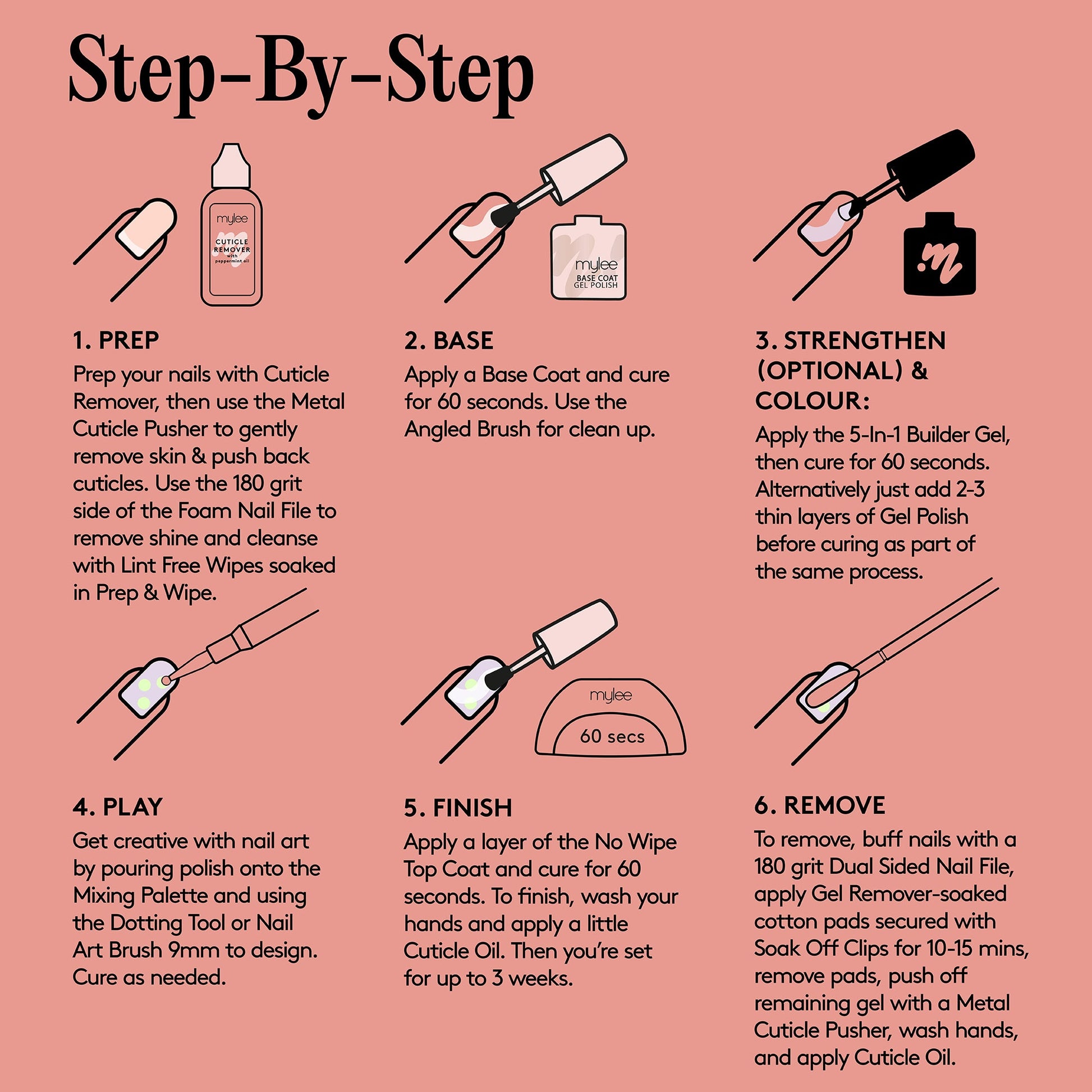 Seal the deal with a Top Coat and cure for 60 seconds. Wash your hands, apply Cuticle Oil, moisturise, and enjoy salon-quality nails for up to 3 weeks!