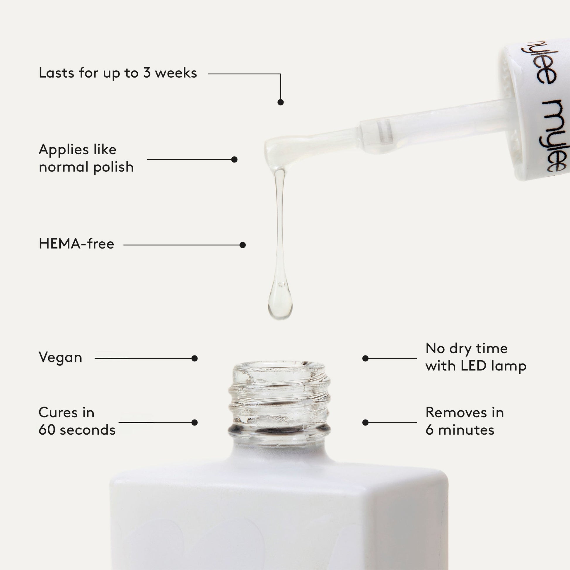 Seal the deal with a Top Coat and cure for 60 seconds. Wash your hands, apply Cuticle Oil, moisturise, and enjoy salon-quality nails for up to 3 weeks!