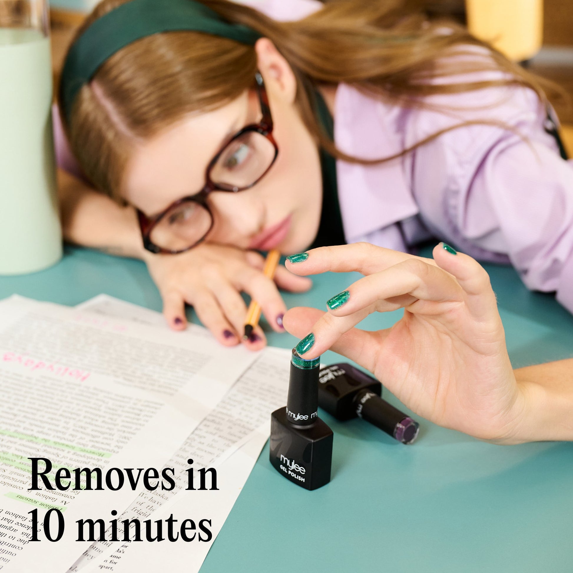 Consider your mani fully enrolled. Top of the Class features four standout shades that pass every test: Alumni, a shimmering teal with serious main character energy; Drama Club, a speckled lavender that’s always scene-stealing; Ink Spill, a smart, shimmery indigo-violet; and Lecture Notes, a pearlescent nude yellow that’s quietly top tier. Each gel cures in just 60 seconds, is chip-resistant, and stays salon-glossy for up to 3 weeks.